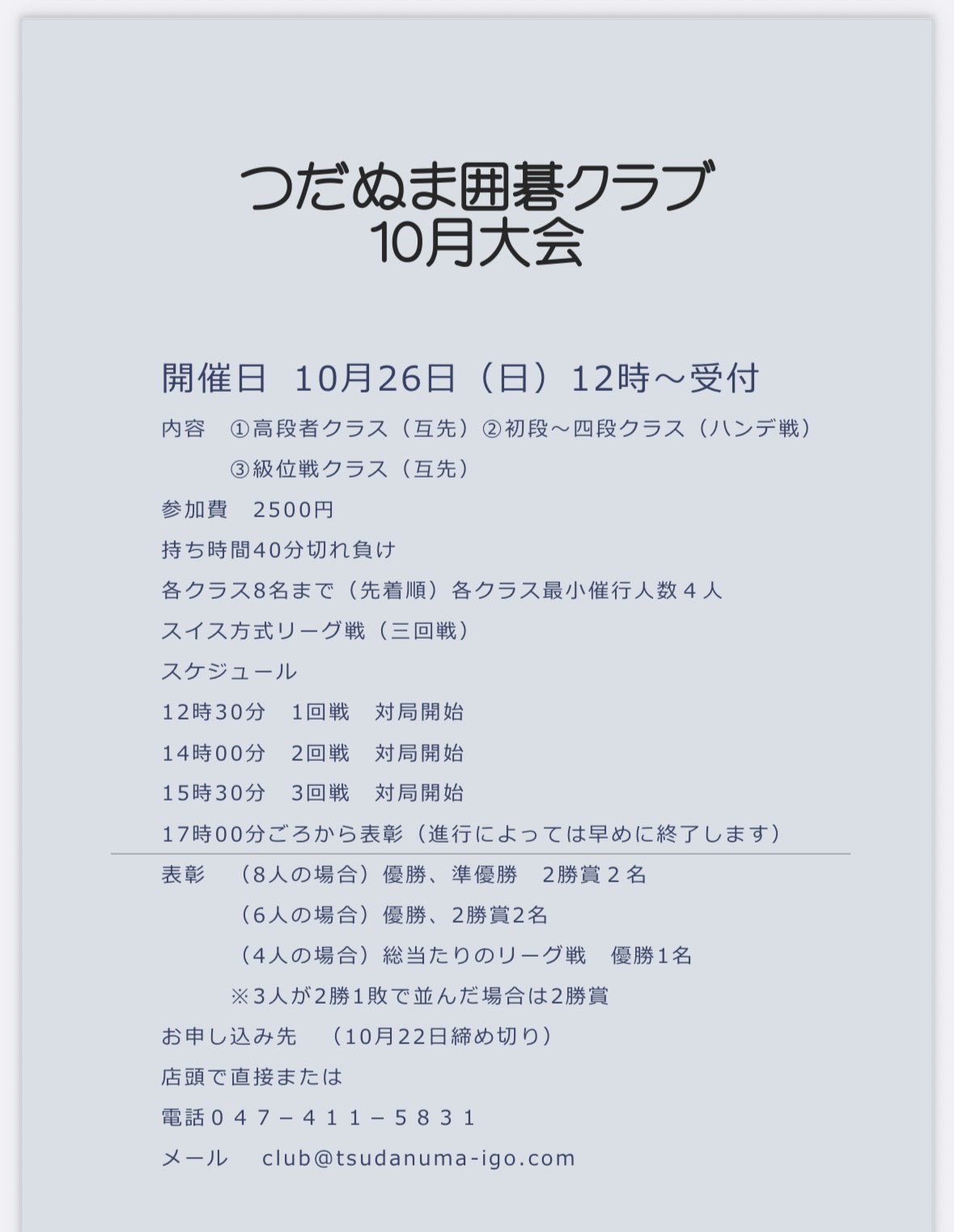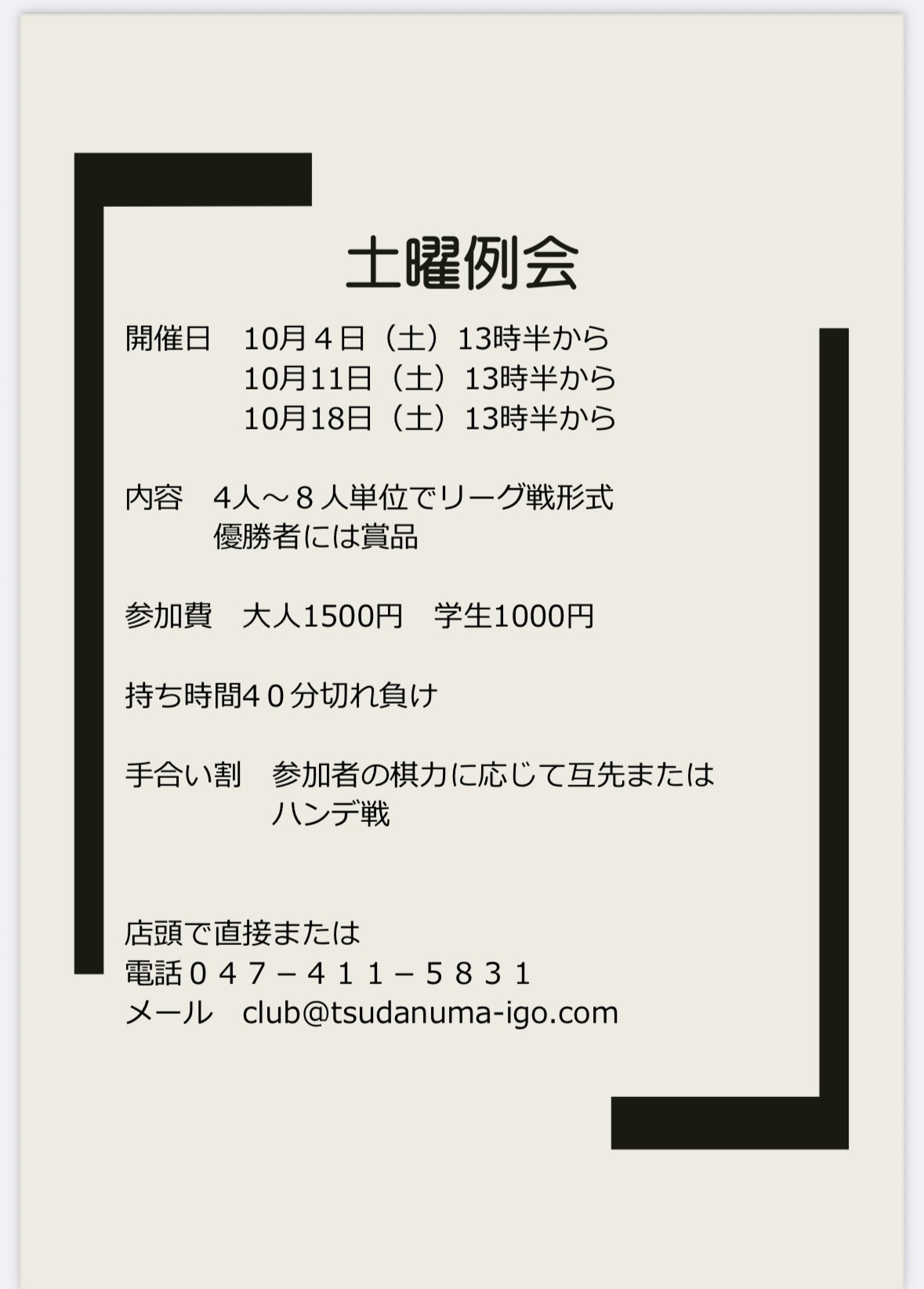 一般対局は13時からスタートします つだぬま囲碁クラブのホームページです。 つだぬま囲碁クラブは千葉県習志野市京成津田沼駅改札を出てすぐのところにある 碁会所&囲碁教室です 榧やヒバのきれいな碁盤で12面、座席数はゆったり快適な24席です。 午前中はレベル別の教室、午後からは一般対局となります。 こども向けの教室「ジュニア教室」は現在小学生から難関校に通う高校生まで 一緒に勉強して切磋琢磨しています。頭を鍛える囲碁を始めてみませんか