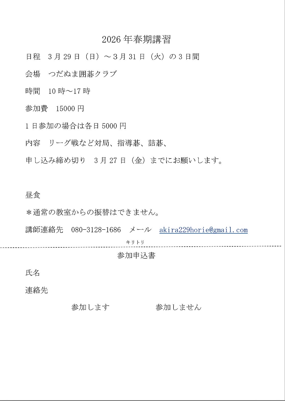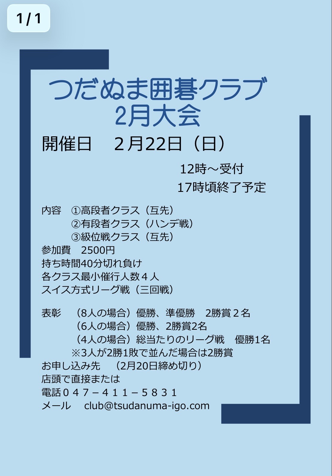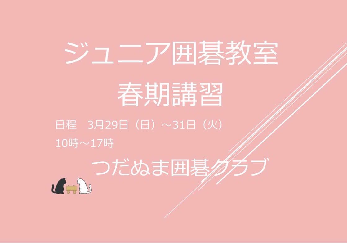 一般対局は13時からスタートします つだぬま囲碁クラブのホームページです。 つだぬま囲碁クラブは千葉県習志野市京成津田沼駅改札を出てすぐのところにある 碁会所&囲碁教室です 榧やヒバのきれいな碁盤で12面、座席数はゆったり快適な24席です。 午前中はレベル別の教室、午後からは一般対局となります。 こども向けの教室「ジュニア教室」は現在小学生から難関校に通う高校生まで 一緒に勉強して切磋琢磨しています。頭を鍛える囲碁を始めてみませんか